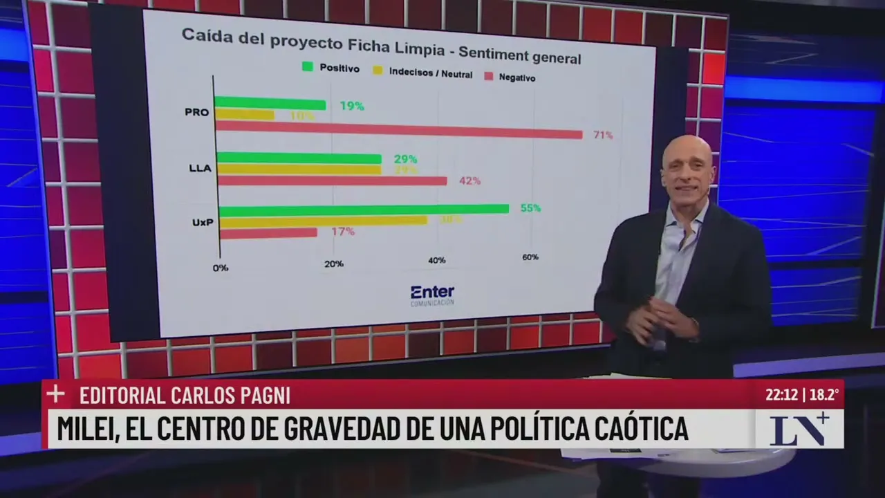 del Pro 19 vio como positivo es la línea verde que se haya caído la posibilidad de este proyecto de ficha limpia cuidado no es que se rechazó eh No hubo quórum para tratarlo probablemente el gobierno lo mande en extraordinarias 10% está indeciso en el pro Los votantes del Pro 71 por en contra había encuestadores haciendo un estudio de opinión pública en la capital Federal estos días cuando sucedió esto de ficha limpia el Pro como opción electoral subió 10 puntos del mismo modo que había subido Miley 10 puntos cuando le quitó la jubilación a Cristina kirner