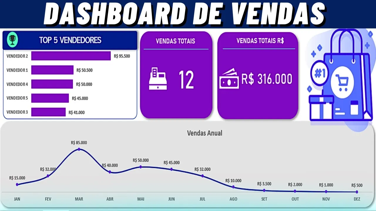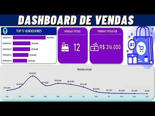 nesse vídeo eu vou te ensinar a criar esse dashboard de vendas aí na sua planilha é um dashboard de vendas moderno e muito prático nele você vai ter alguns indicadores sendo eles o total de itens vendidos aí na sua planilha você também terá o total de vendas em reais e além disso você terá de Janeiro a Dezembro todas as vendas mês a mês os valores que foi vendido E além disso você terá também o top CCO dos melhores vendedores então é um painel é um dashboard de vendas totalmente completo e moderno para que você possa