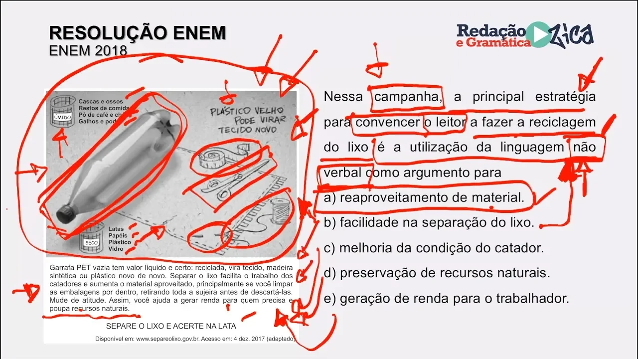 nós lemos aqui o texto gente ó aqui fala sobre separar o lixo facilita o trabalho dos catadores então não estou honrada alternativa porém onde que nós temos que focar para resolver o exercício na linguagem não verbal é por isso que tem muita gente que perde a questão que perde alternativa perde porque não prestou atenção que o foco para responder é aqui o prestar atenção na linguagem verbal melhoria da condição do catador opa professora o texto fala né que separar ajuda ali né aproveitar mais o material facilita o trabalho dos catadores realmente está errada essa alternativa
