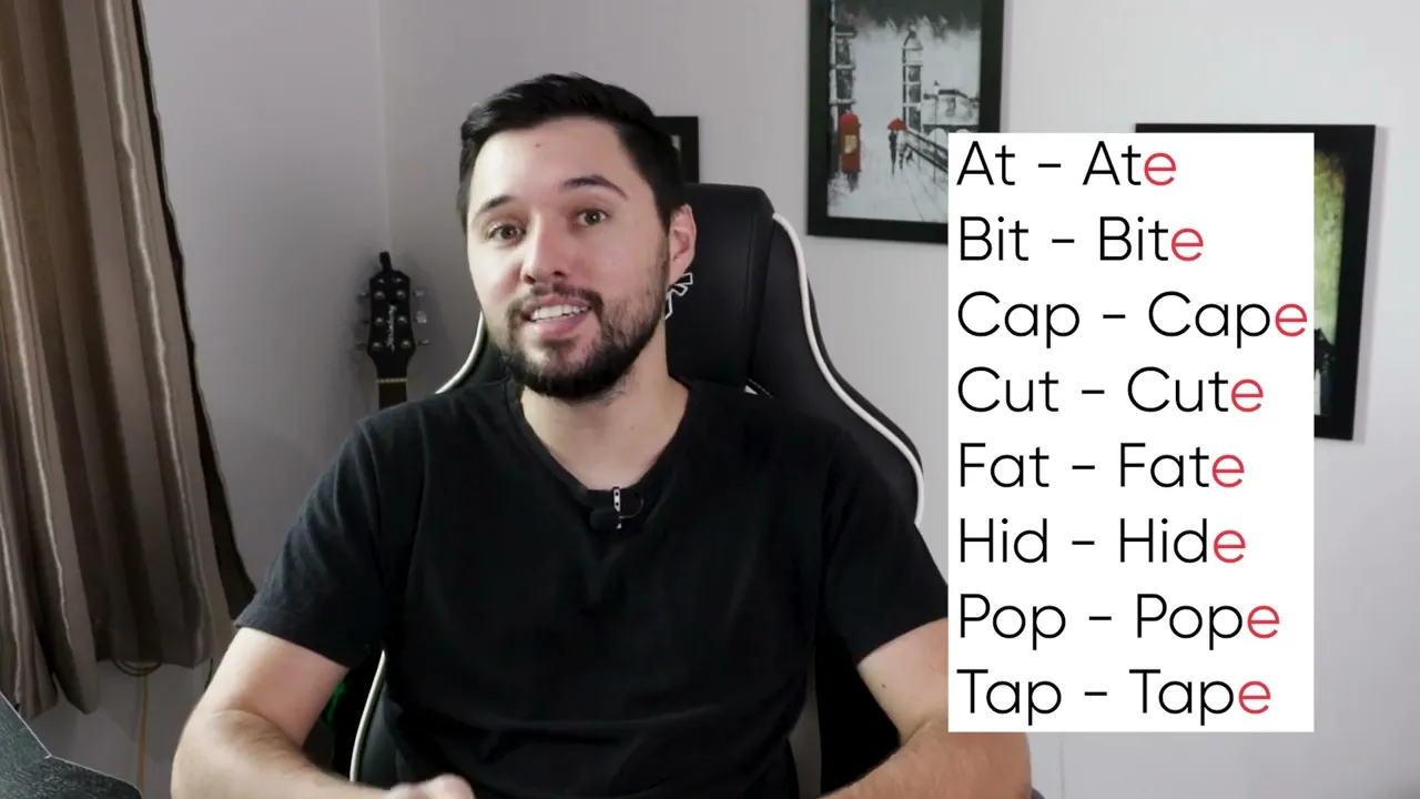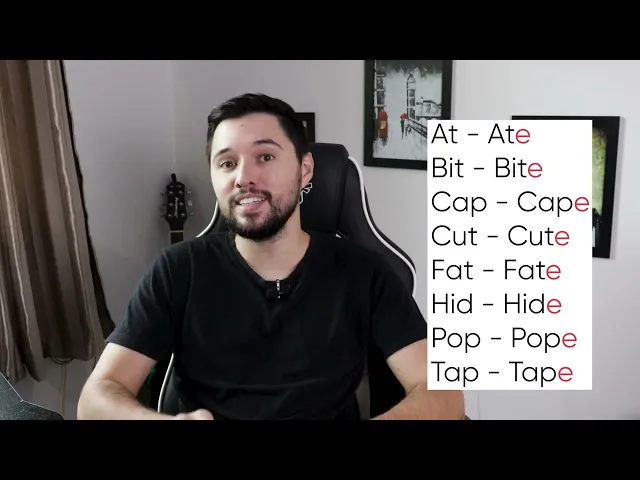 Hey guys sejam bem-vindos a mais uma aula do módulo de pronúncia nessa aula aqui eu vou ensinar para vocês uma técnica eh uma regrinha na verdade né que é chamado de Magic e ou então né um nome mais formal né mais sério é Silent e é quando a gente tem no final da palavra a letra e tá ess esse e no final da palavra ele vai ajudar a gente a determinar Qual que é o som da vogal que tem lá no meio da palavra palavra tá mas é uma regra que tem exceções então é o