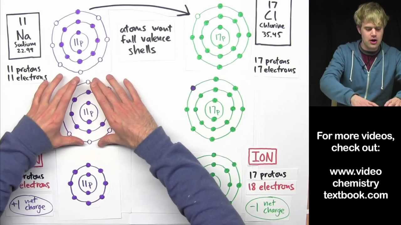 a transfer of electrons takes place between these atoms giving this one a positive charge and this one a negative charge and what the opposite charges like to do they like to stick together and so this is what we end up with the two atoms glued together because their opposite charges are holding them together okay so there are really three important steps in an ionic bond forming for the example of sodium chloride here's what they are the first step is an electron transfers from sodium to chlorine sodium gives one of its electrons to chlorine sodium loses