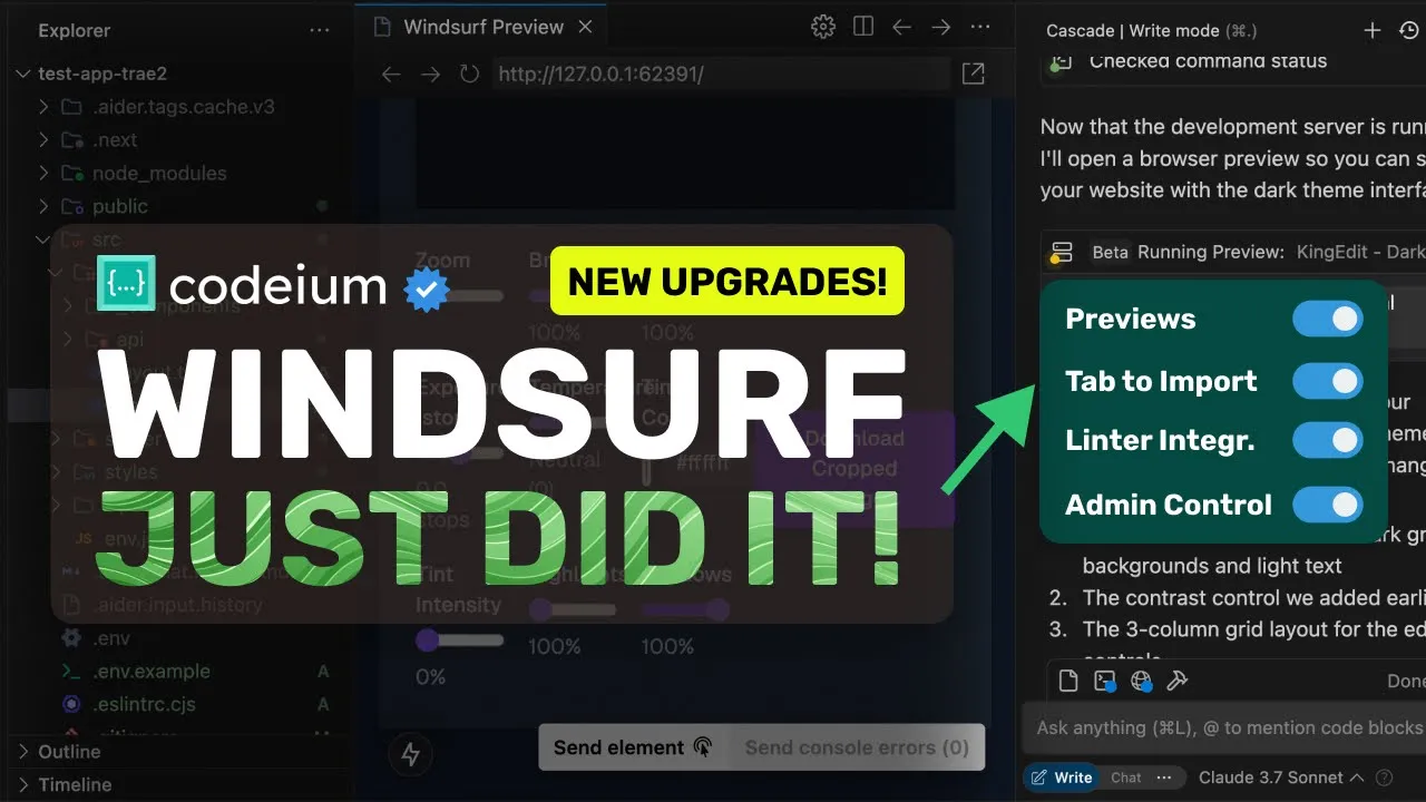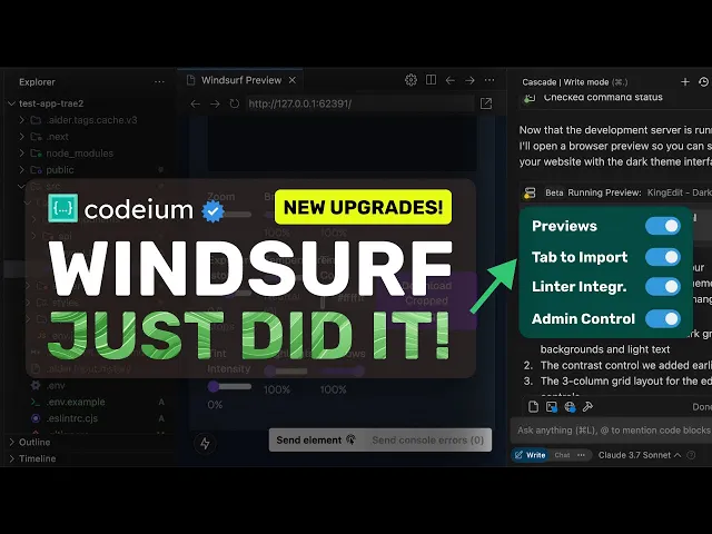 to the video now first of all make sure that you upgrade windsurf to the latest version once done we can now start using the new features so let's start with the main preview feature first we'll need to ask it to make some changes this is my testing app that allows me to edit an image in multiple ways I wanted to add a new dial in it to change the contrast once we do that you'll see that it starts working on it also many people ask me what model I use well in windsurf I use 3.7