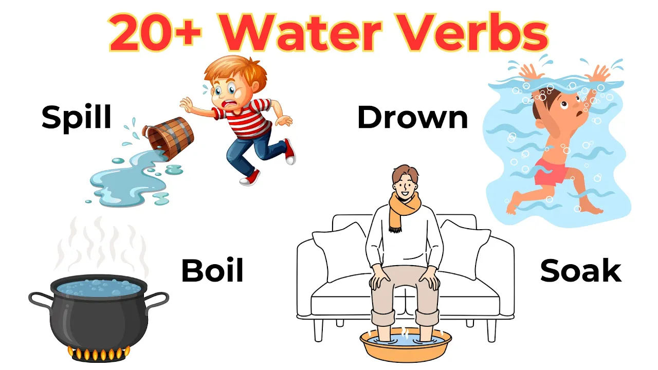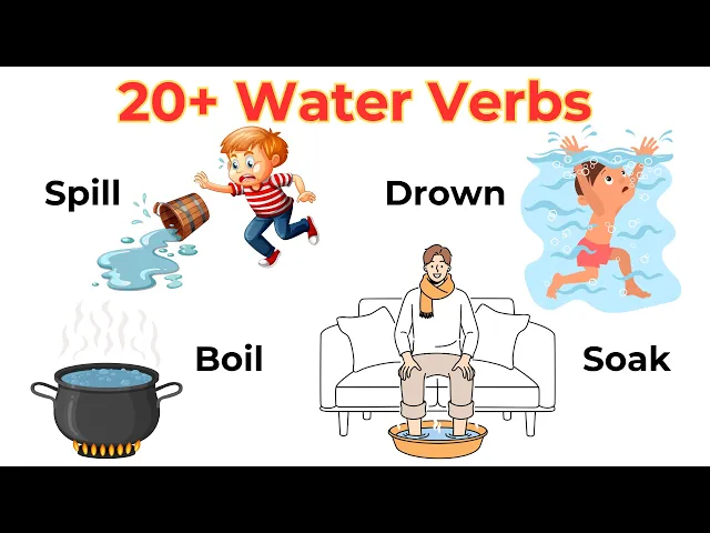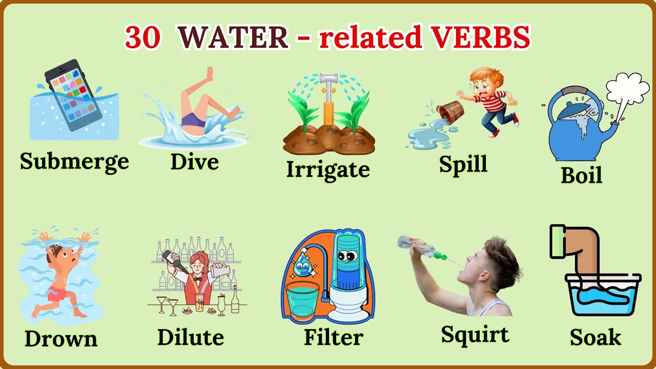 small drops or particles over something I sprinkle water in the garden I sprinkle water in the garden I sprinkle water on the clothes before ironing I sprinkle water on the clothes before ironing sprinkle sprinkle submerge submerge to completely put something underwater or another liquid I submerge the vegetables in water I submerge the vegetables in water she submerges herself in the pool she submerges herself in the pool submerge submerge wash wash I wash my hands with soap and water I wash my hands with soap and water she washes the car every weekend she washes the car