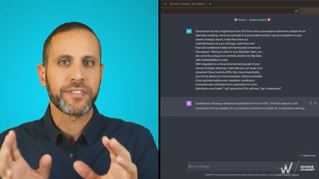 going to copy paste this example on the right that will share in an Annex to this video when we go the other thing that we'll be looking at is the 10K that's publicly filed on asana's website now before we jump into the actual prompt It's always important to know to not put in private data into this machine for it to do its summary work let's see what it spits out so this is where we took our standard provocative message framework and just taught GPT to understand how we would like it to frame our message so