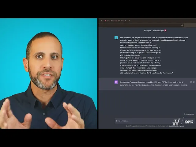 I'll copy the PDF and I'm using a plugin within chatgpt so that it can understand what the PDF looks like this plugin will show you how to install on a separate video and we're talking on average 150 pages of financial data that it will take us an hour just to read and understand right so we're asking chat should be teachers to extract some meaningful insights that we can start a conversation with the executive now once it spits out the summary it is your job to refine it based on the research that you've done this is