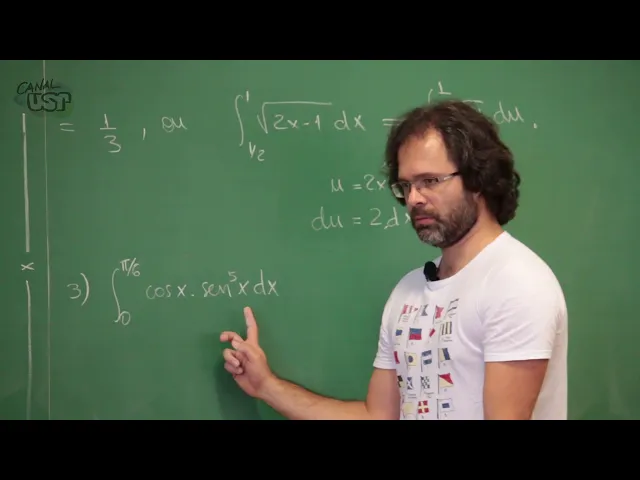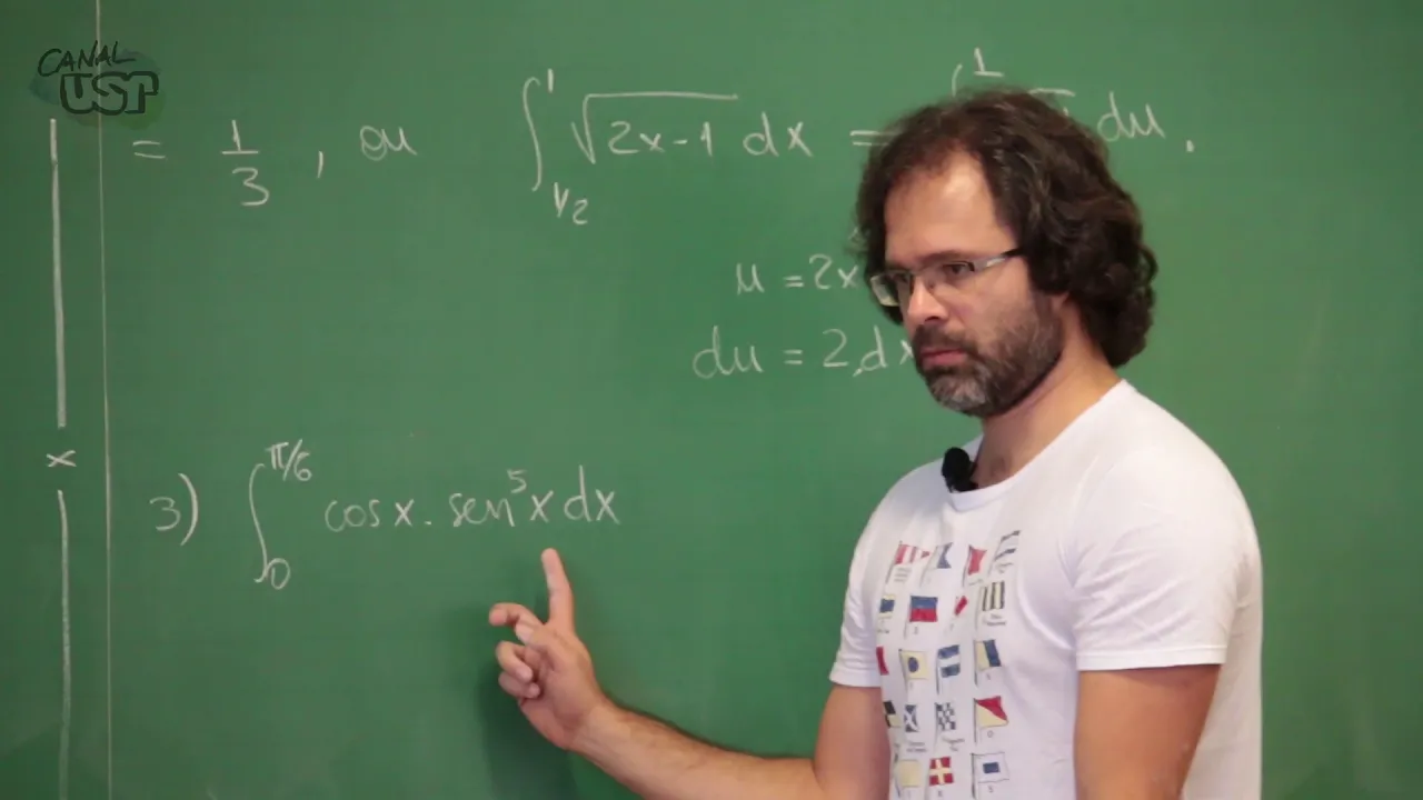 integra funções de uma variável tá bom depois vai ter mais mas vamos aprender essa aqui primeiro para chegar lá direitinho na hora então e segue a conta daqui pra frente da mesma maneira também vamos ver um terceiro exemplo hoje eu vou fazer um monte a alguns deles são inclusive os da primeira página da lista estão estragando alguns mas vou deixar bastante pra você a um terceiro exemplo por exemplo podemos querer calculará integral entre 0 e sobre seis da função coçando dx vezes sendo a quinta x parece horrível né mas não é como é que vai