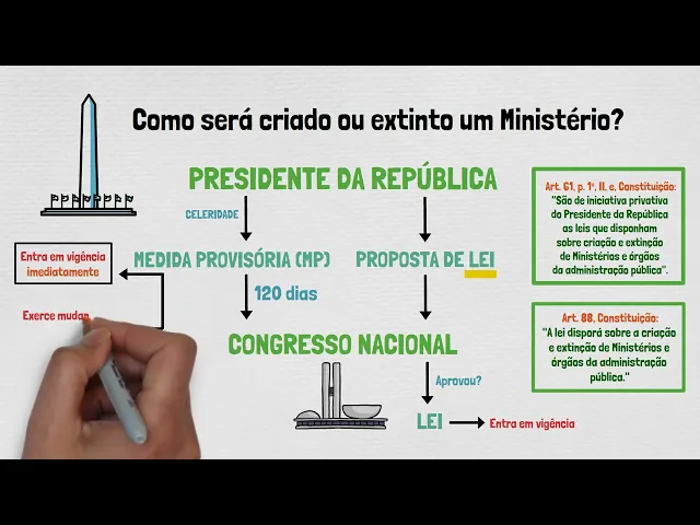 nomeados livremente também poderão ser destituídos do cargo sem qualquer justificativa para criar extinguir reorganizar ou estruturar um ministério o Presidente da República deverá apresentar uma proposta de lei que será submetida o Congresso Nacional para aprovação neste sentido inclusive é a orientação da nossa Constituição Federal no entanto na prática para dar celeridade ao processo é possível que o Presidente da República Edite uma Medida Provisória a mp é uma espécie de Norma que entra a exigência imediatamente mas que precisa ser votada pelo poder legislativo em até 120 dias assim o presidente exerce as mudanças cabíveis instantaneamente mas