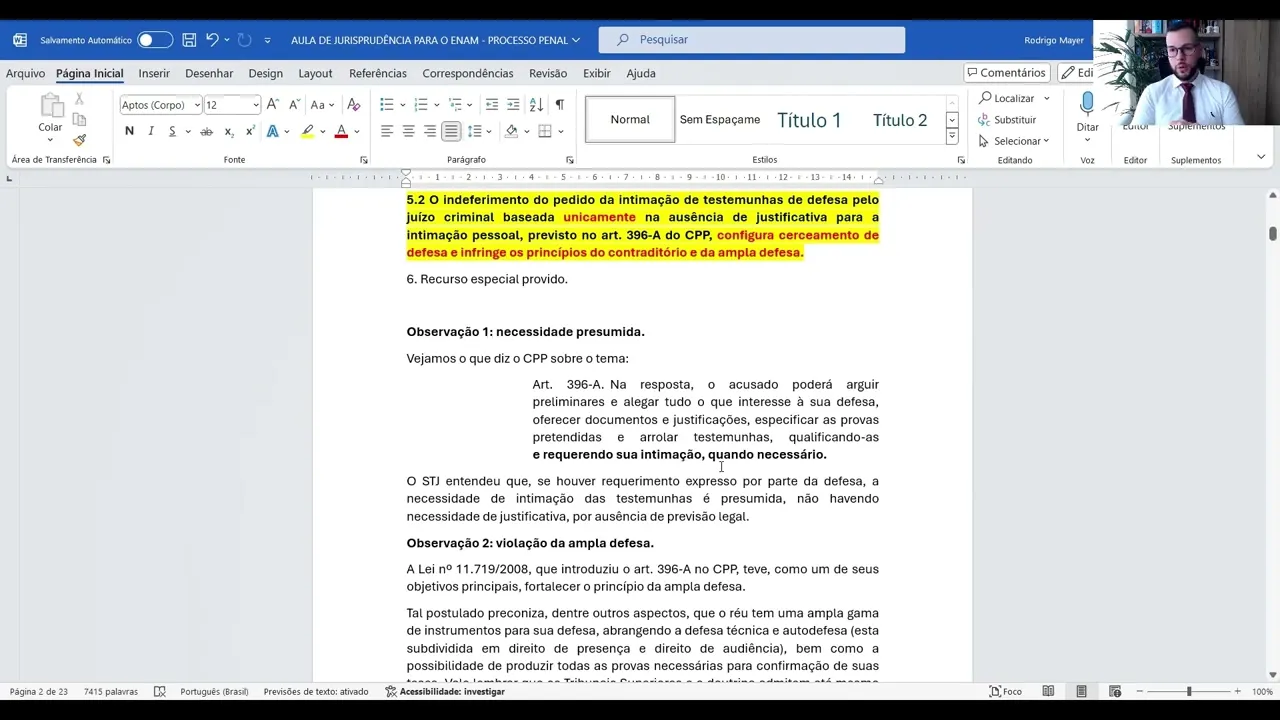 indicação de de de violação dampa defesa eh por parte do Superior Tribunal de Justiça nesse julgado se deve sobretudo ao fato de que em 2008 com a reforma process pessal promovida pela lei 11719 que introduziu o artigo 396 a esse dispositivo que acabamos de ler no CPP teve justamente como um dos seus principais objetivos o fortalecimento do princípio da ampla defesa Esse é sim foi sim um dos principais objetivos da Lei 11619 e que dentre outras coisas incluiu o artigo 396 a do CPP nós sabemos que o princípio eh da ampla defesa né preconiza Eh