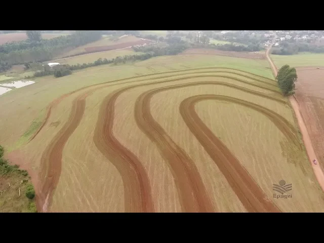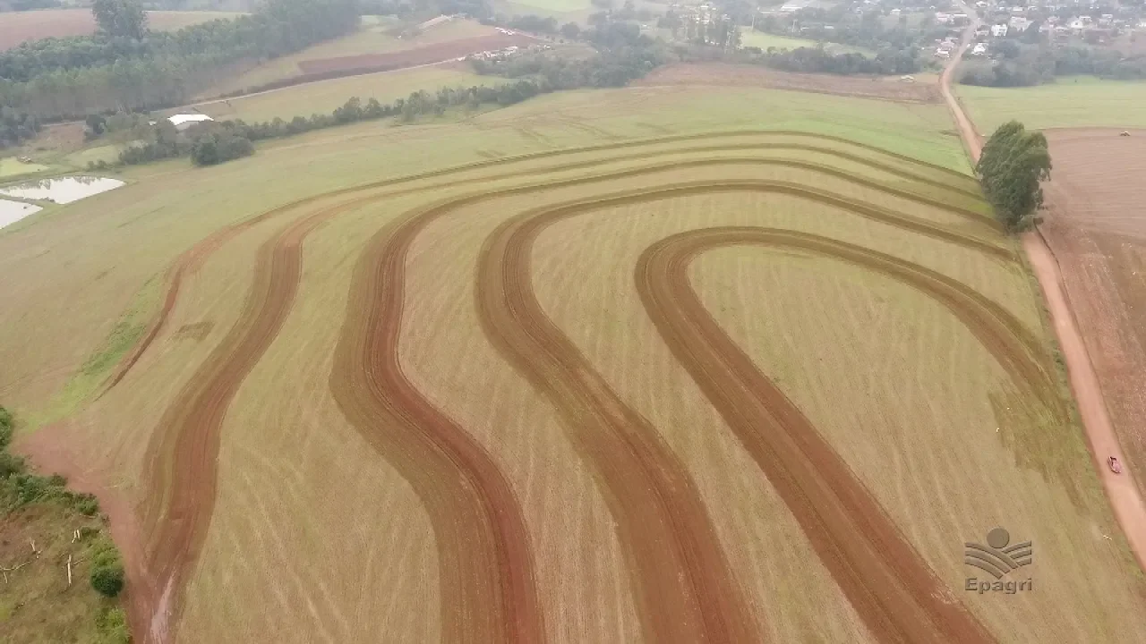 de terraços também é popular entre os agricultores principalmente aqui no oeste do estado onde os terrenos são inclinados por isso o manejo ea conservação do solo sempre estiveram entre as principais ações do trabalho da epagri a água que vem pela acho pelas gotas de chuva nós podemos resolver esse problema assim como já resolvemos cobrindo o solo dando uma proteção ao solo nós quando ela começa a escoar essa proteção pela cobertura não é eficiente então nós temos que manejar esta água que escoa a única maneira de manejar é cortar o lance antes né em várias fatias