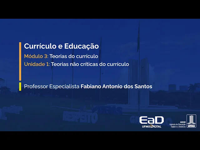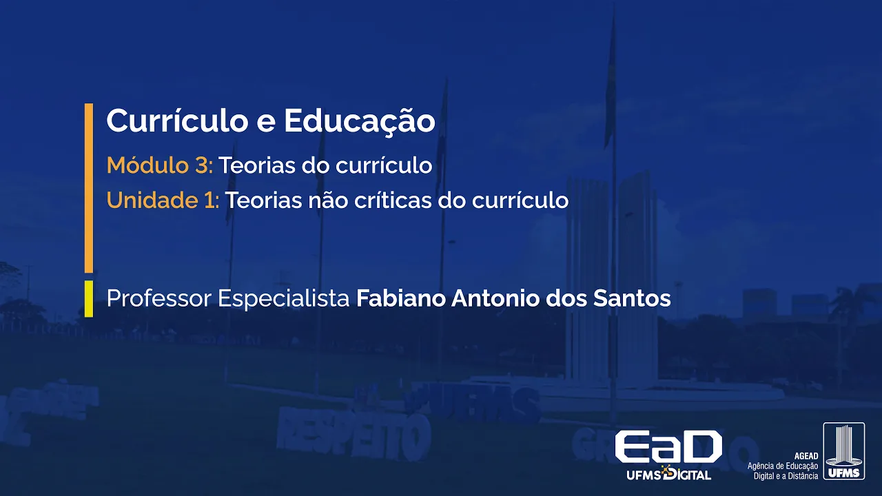 [Música] Olá tudo bem Eu sou Fabiano Santos e vou trabalhar com vocês mais um encontro mais uma aula sobre currículo educação hoje vamos discutir sobre teorias do currículo a primeira delas as teorias tradicionais do currículo vimos as aulas anteriores que o currículo deve ser pensado articulado a concepções sobre ser humano sobre educação sobre sociedade isso significa dizer que currículo é uma prática envolve uma prática muito complexa não é no nosso último encontro discutivo sobre a história do currículo espero que vocês lembrem que discutimos a importância de não demarcar o currículo a história dele a partir