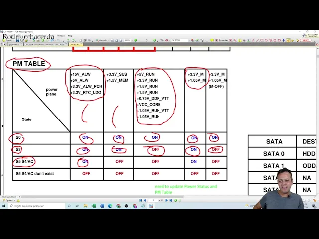 E é só dando sequência aqui a nossas aulas de esquemas elétricos eu vou tentar fazer essas aulas de esquemas elétricos uma forma totalmente diferente todas as aulas que eu já tive até hoje tá Vou tentar ser assim o mais breve possível e o mais objetivo possível tá que acontece eu quero mostrar para vocês aqui agora a gente já já viu aí sobre o bloco né diagrama em blocos e agora Quero mostrar é um outro diagrama que eu gosto de ver mas não é em blocos esse deixa o compartilhar com vocês até ela aí tá que é esse aqui ó que chama PM table tá eu acredito que esse PM é de power Management tá tabela e gerenciamento de power tarde tensões tá você não vai conseguir encontrar essa tabela em todos os esquemas elétricos não é que eu separei ó em alguns esquemas elétricos que tem mas por exemplo esse daqui já não tem Eu tava olhando aqui não tenha Depende de uma forma um pouco diferente tá e a gente vai abordar também ajuda forma que eu quero mostrar para vocês é o seguinte isso aqui para mim é praticamente é é 90 porcento tá das vezes quando eu pego uma placa ela não está ligando tá com algum problema eu já procuro direto esse PM table Tá eu vou explicar o porquê tá esse PM tempo não é uma tabelinha aonde mostra quais são as tensões que deveria estar presente na placa tá Então olha só eu tenho aqui o s 0 o S3 S5 S4 tá E aqui também é só para vocês entender o que que é o s o s o está o estágio né então falar estado também né achou eu vou eu vou trazer como está e vai ser melhor tá então nós temos o estado cinco e quatro né o estado três e o estado zero tá é existe um estado também chamado G3 o estado do G3 para gente faz o menor sentido porque estados é o estado G3 é quando não tem alimentação nenhuma na placa-mãe tá então se você não tem uma bateria conectado ou você não tem uma fonte conectado é o estado do G3 Tá mas ninguém análise dessa forma né então aqui ao estado cinco tá é quando aqui ó tá falando aqui ó não existe a fonte houzz e é a fonte tá então é quando não existe a fonte tá é esse seria um estado cinco tá o estado aqui fala está dos cinco estado quatro mas na verdade é sempre contar um pouquinho confuso eu gosto de chegar aqui ó vamos mostrar aqui ó quê e é melhor então o Estado cinco aqui as colocaram Unidos também geralmente não é unida sim mas o estado cinco é quando ele está somente na bateria na tensão de ser Ou seja somente na bateria tá se ele tiver somente na bateria quais extensões que eu devo ter na placa naquele momento aqui no caso ele me mostra que eu tenho que ter essas quatro tensões aqui se ele estiver somente com a bateria pessoal ele não ainda ele não foi ligada não teve o botão pressionado para denunciar Tá bom então é só para constar o seguinte peguei o notebook ele tá com a bateria dele tá então na placa-mãe as tensões que tem que ter sem o pressionar o botão sem eu fazer nada com ele desligado vamos dizer assim com a bateria conectada eu tenho que ter aqui ó tá vendo on ou seja ligado ou desligado então eu tô aqui ó estado cinco tá aqui tá 5 e 4 Olá tudo bem mas algumas vezes vocês vão ver estado cinco que vai ser para bateria estado quatro quando ele está com a somente na fonte tá ponte que bateria no caso Ok então estado cinco somente na bateria Eu tenho que ter essas quatro tensões aqui tá bom então tem que procurar por essas quatro atenções na placa se eu não tiver alguma dessas tensões eu já encontrei o defeito Ok bom depois ele tem aqui ó tá vendo aí aquele mostra tudo off off off off off quer dizer nenhuma dessas outras tensões aqui na tabela vamos estar presente e nenhuma delas tá vendo no estado cinco ó não tenho nada aqui não tem retenção e não tem mais atenção Ok a bacana Rodrigo e se ele tiver com a ponte conectada você tiver com a fonte conectada Quais são as tensões que eu tenho que ter na placa eu tenho que ter na placa essas quatro tensões que tá aqui tá e também já voltei essas outras tensões aqui ó vocês tão vendo que você tá bom então essas tensões aqui também terão que está presente na placa Ok Então olha só e as demais Fofi não tá ok a legal Rodrigo o estado três é o estado quando ele estiver suspenso tá também pode colocar excitado três quando ele liga sem imagem quando ele tava faltando uma memória alguma coisa assim também funciona Tá mas coloca na sua cabeça que quando ele estiver suspenso em Bernardo ou alguma coisa assim a gente praticamente não usa muito esse estado aqui tá o estado três mas se ele tá ligando sem imagem né E você já já já testou lá a a memória EA memória está conectado na placa aí você vai ver que ele tem que ter essas tensões aqui ó olha sensuais tão são todas essas tensões que estão aqui mas essa aqui tá vendo ó tem até uma mais 1. 2 volts de DR ó tá vendo É o tempo que atenção de memória também tá então aqui no caso seria ddr4 né mas 1. 2 volts lr41 tá eu tenho aqui essa atenção aquele com esse nome e essa atenção com esse nome depois a gente vai abordar com relação aos nomes tá não preocupa Por enquanto não é e quando ele tá s0 que é em pleno funcionamento tá no estado Zé ele tem que estar com tudo ligado e todas essas tensões tem que estar presente na placa beleza isso pessoal sempre quando vocês pegarem o esquema elétrico vocês podem orar Às vezes você vai encontrar ele igual aqui ó nas primeiras páginas Mas às vezes não às vezes vocês vão ter que ir lá para as últimas páginas nunca no meio tá ou vai estar lá no final do esquema elétrico ou vai estar lá no início do esquema elétrico tá bom ou vai ser um ou vai ser outro nunca no meio tá nunca no meio então você já Olha lá em cima lá você vem aqui as primeiras páginas o seu olhar aqui achei aqui ó tá vendo aqui Ah então tá aqui bacana se você não achou aqui continua descen
