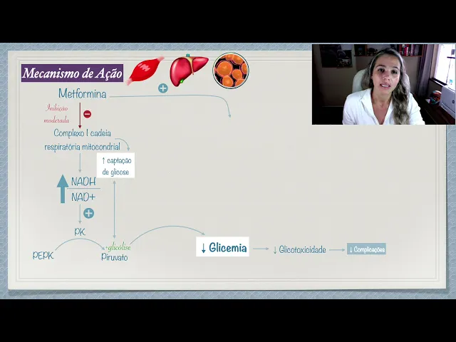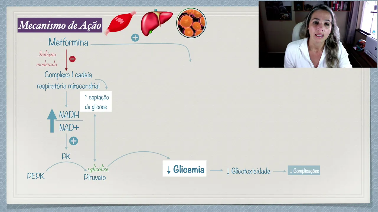 alvos que ele consegue mexer alguns moleculares tá E ele consegue que esse medicamento ele altera interfere isso vai produzir uma melhora de sensibilidade insulínica Então vamos falar um pouquinho aqui como é que ele funciona então basicamente a gente o efeito da metformina vai ser né aqui pensando em controles glicêmicos tá ela fosse ainda outros efeitos extras Vicente e a gente vai ter em cima daqueles tecidos que são os alvos da insulina principalmente músculo esquelético e o fígado tá esses vão seus principais alvos a gente também tem feito em cima do tecido adiposo Ok então vamos