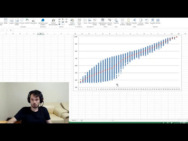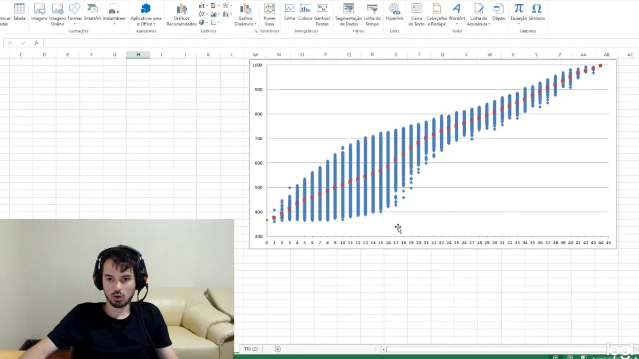 então eu fiz um gráfico aqui pra exemplificar essa aqui para ficar um pouco melhor e esse aqui é um gráfico de dispersão e referente aos dados boi em 2018 da prova de matemática que esse gráfico tá falando difícil né no eixo horizontal a gente tem os dados de acertar então a gente tem acertos é um dois três até 45 e aqui no eixo vertical a gente tem a nota do enem a nota que a pessoa realmente recebeu eu voltei esse gráfico aqui com uma amostra das 4 milhões de pessoas que está na prova de matemática