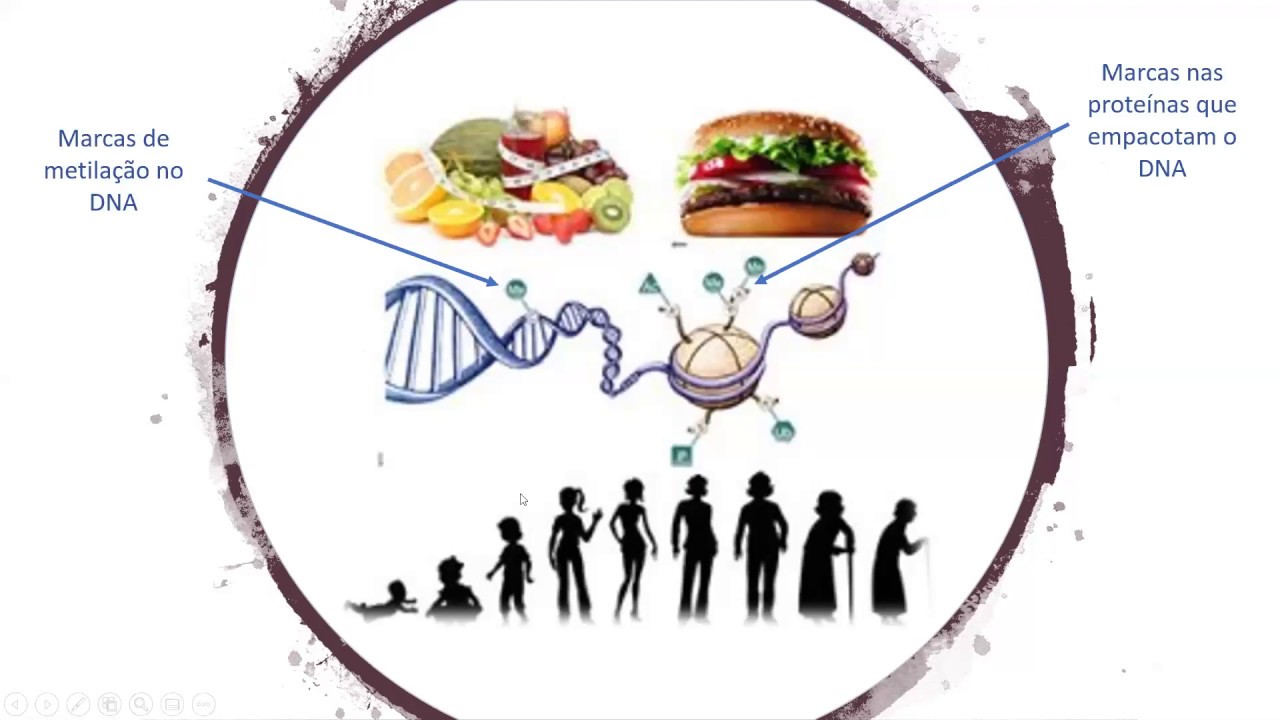 a gente chama de epigenética e por que tá em cima né esse genética são marcas químicas que podem ser colocadas por exemplo dna são ao longo da nossa vida nós deixamos as nossas marcas então além das rugas e além da gente ficar mais curvadinho mais velhinho a gente também adiciona no nosso dna marcas uma coisa por marcas de metilação no nosso dna ou a gente pode deixar marcas nessas proteínas que empacotam nosso dna e isso a gente vai acumulando a gente vai mandando essas marcas ao longo da nossa vida dependendo do estilo de vida que