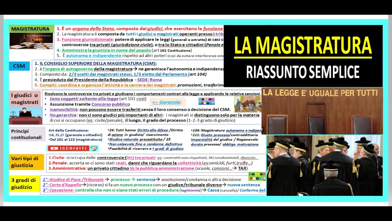 Ciao a tutti in questo video facciamo un riassunto breve e semplificato della magistratura e iniziamo a dire che la magistratura è un organo dello Stato quindi è previsto dalla costituzione ci sono proprio degli articoli che ne parlano è composta da tutti i giudici che sono chiamati anche magistrati e questi lavorano presso i tribunali Inoltre i giudici esercitano la funzione giurisdizionale cioè il potere di applicare le leggi leggi che sono generali astratte che vengono applicate ai casi concreti ai casi che succedono quotidianamente per risolvere quelle controversie quelle liti tra i privati cittadini e allora si parla