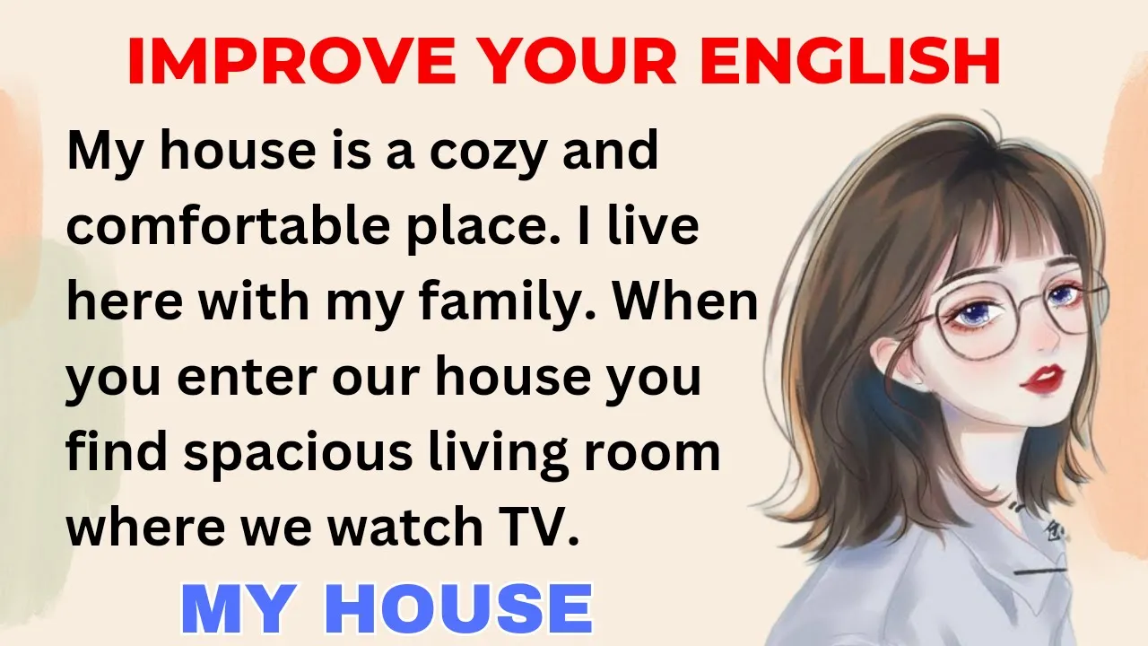 welcome to my channel learn English with Jasmine hi friends today's topic is my house listen carefully and then repeat each sentence with me my house is a cozy and comfortable place I live here with my family my mom's name is Emma she is a teacher my dad's name is John he is a manager in a bank my younger brother Peter is 14 years old when you enter our house you will find a spacious living room where we watch TV next to it there is a kitchen where we cook delicious meals we eat in the dining