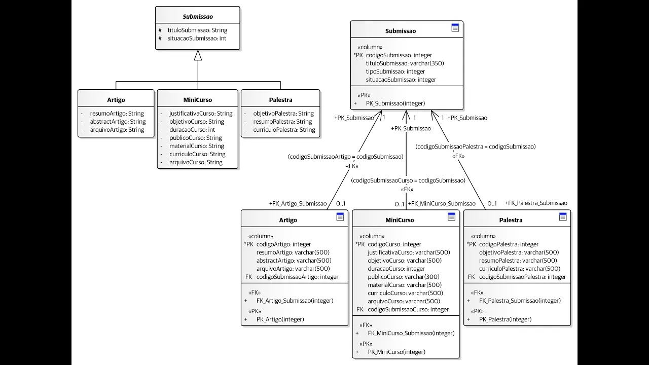 se saber se h a submissão se refere a um artigo um minicurso e uma palestra em cada tabela cada uma das tabelas artigo minicurso e palestra foi necessário criar uma chave estrangeira no caso de artigo foi código da submissão código da submissão do artigo artigo no minicurso código da submissão do curso e na palestra o código da submissão da palestra então no momento que eu quiser recuperar as informações referentes à submissão a qual o artigo se refere eu tenho que pegar a chave estrangeira código código da submissão do artigo e comparar com o campo código