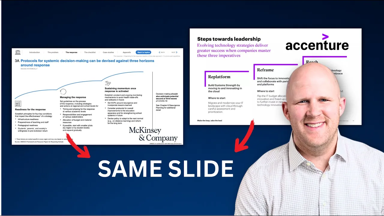 in the next 10 minutes I'm going to teach you how to build 90% of the PowerPoint slides you're ever going to need to build especially if you work in a PowerPoint heavy career like Consulting Finance or strategy one of our most requested video topics is how to build popular PowerPoint slides so to prep for that I recently went through as many presentations as I could get my hands on mostly from bigname consulting firms like McKenzie Bane and BCG and I found something really interesting most of these consulting firms tend to use the same slide layouts