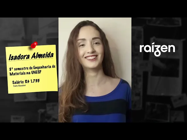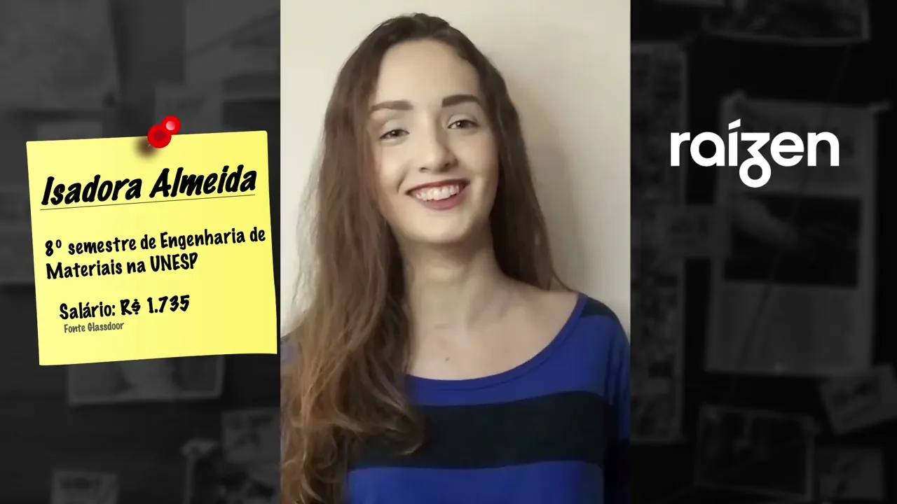 Oi pessoal meu nome é Isadora eu tô fazendo engenharia de materiais na Unesp e atualmente eu tô no quarto ano ou no penúltimo ano da faculdade eu tô vindo aqui contar um pouquinho para vocês como que o estagiário sor Como que o programa como conseguir um estágio realmente me ajudou a conseguir um estágio na raiz bom no começo meio desse ano eu tinha começado a prestar alguns processos seletivos de estágio uns três ou quatro mais para começar a treinar até porque infelizmente minha faculdade criou uma regra esse ano que quando você tem uma carga horária