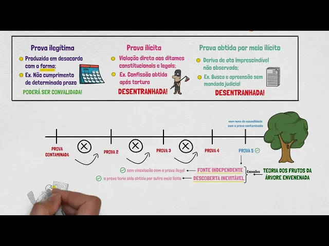 árvore envenenada Porém se não houver nexo de causalidade entre a prova ilegal e as outras produzidas na sequência não há que se falarem eliminação da prova assim quando se estiver diante de uma fonte independente onde não há vinculação com a prova ilegal a nova prova será válida do mesmo modo se as provas derivadas se tratarem de uma descoberta inevitável ou seja se Muito provavelmente a prova teria sido obtida por outro meio lícito também não há que se falarem sua exclusão assim lembre-se que a prova ilícita não contamina as provas subsequentes que forem angariadas por fonte