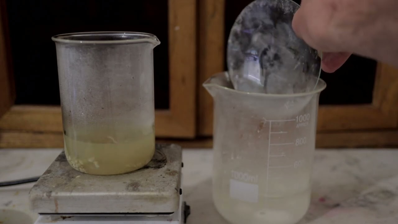 the aluminum sulfate to produce potassium aluminium sulfate potassium solemate sulfate may be found in most garden centers but you should clean it up by recrystallization before using it here's this an example of what I've done using the assumption that I have 25 grams of aluminum sulfate in solution I've laid out 12 point 7 5 grams of potassium sulfate which is the one-to-one molar ratio between potassium and aluminum sulfate later much of the water has been removed and I have a little under 100 milliliters of solution remaining I had intended to stop a little sooner we