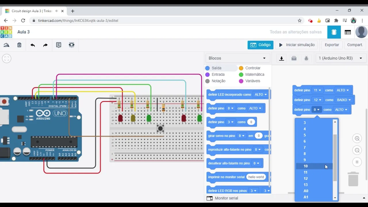 pedestres então nós temos no lugar pelo três vamos colocar aqui definir pinos e né vocês como baixo e definir pelo 7 como alto aí a gente vai colocar aqui um controlar Vamos colocar um segundo aqui no meio aquele espere um segundo E aí eles teste é libera então o semáforo ali dos automóveis né Vamos colocar agora aqui ó aquilo estava sendo vermelho Então vamos colocar pino 13 como baixo 13 baixo né e 11 Alto aí fica perfeito né então ele fecha primeiro do pedestre e depois lhe deram dos automóveis Vamos fazer uma simulação então pra