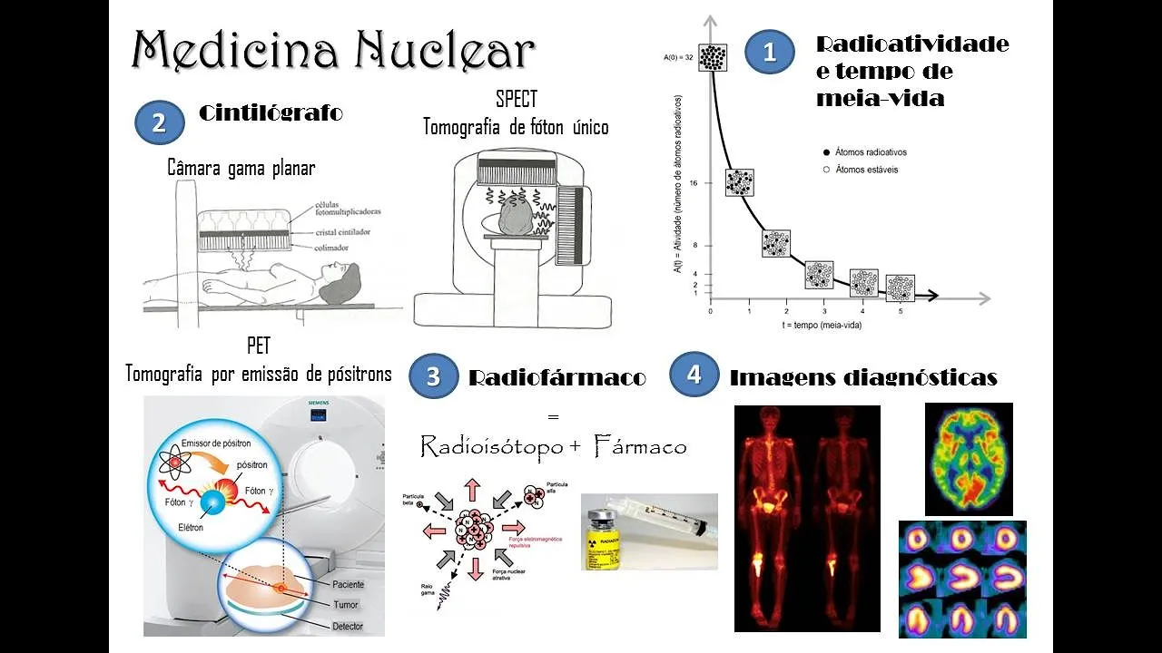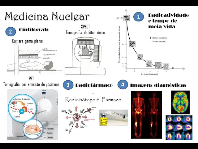 medicina nuclear são usados a átomos radioativos com meia-vida curta e dose pequena baixa os exames utilizados na medicina nuclear são a cintilografia podem ser câmera planares quem imagem bidimensional ou espectros que ao tomografia de faltam único ou Pet que a tomografia por emissão de pósitrons e o radiofármaco que essa molécula é o fármaco ligado com radioisótopos então o isótopo radioativo que vai ser vai emitir as partículas e o fármaco que vai ter afinidade ideológica para certos órgãos o e as imagens diagnósticas formados aí que tem um aspecto muito mais funcional muito mais metabólico em detrimento
