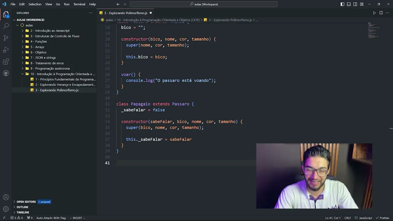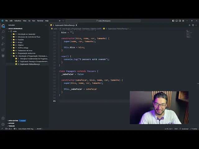 [Música] fala Mestres beleza no vídeo de hoje nós vamos ver aqui sobre polimorfismo né a gente vai entender aqui o que que é e ver o exemplo aqui no nosso código tá então eu já tô aqui com o arquivo criado com o código preparado né que é basicamente o código que nós vimos na aula passada né de herança e então nós temos aqui animal e pássaro né onde pássaro é uma extensão de animal e a ideia de polimorfismo né só recapitulando aqui é basicamente a a capacidade de um objeto ser referenciado de forma igual independente