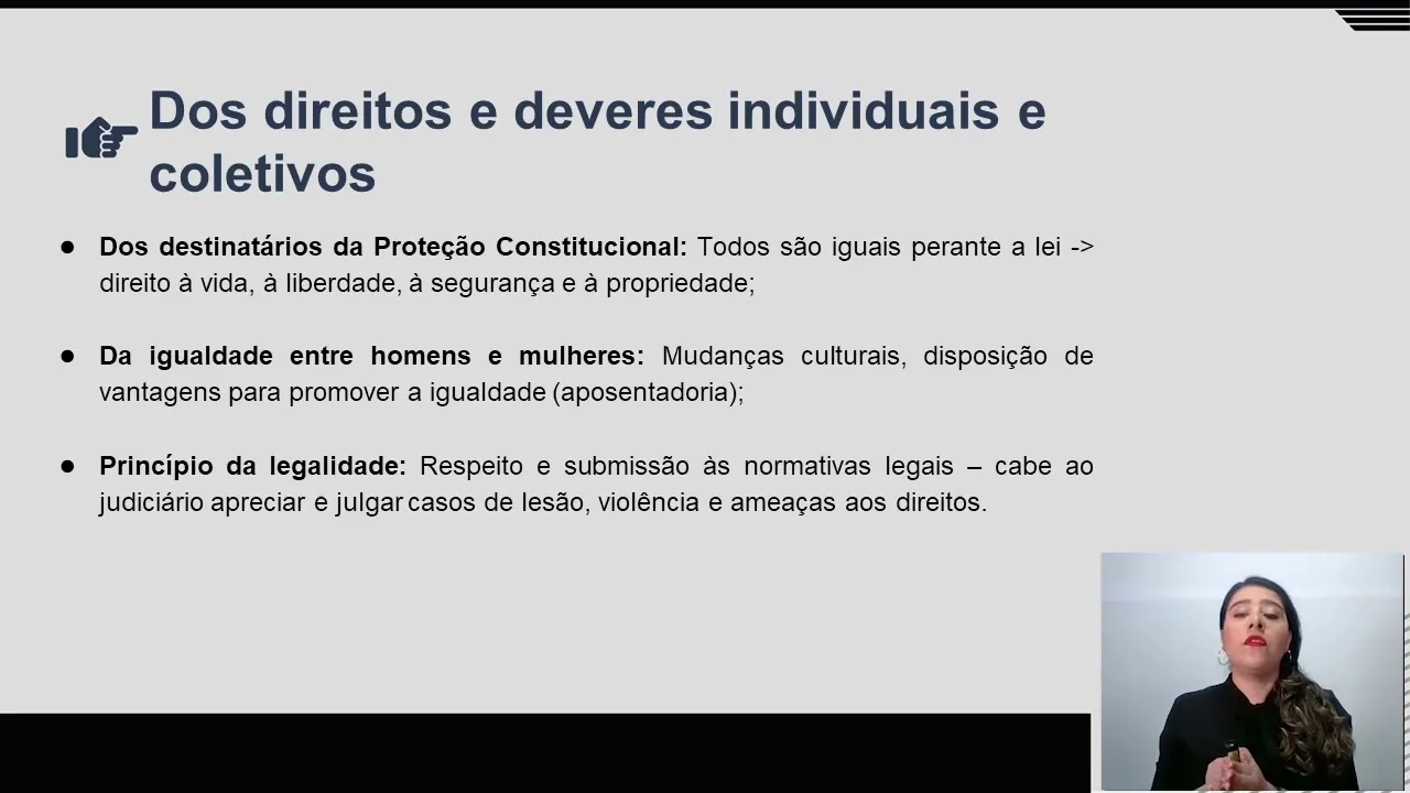 Eu sou professora Gabriela Oliveira e vou estar com você nesse momento. Os objetivos da aula: compreender os princípios fundamentais da Constituição da República Federativa de 1988; compreender os direitos e deveres individuais e coletivos; e compreender os direitos sociais. Retornando ao debate da aula anterior, quando falávamos do Estado democrático de direito, quando trabalhamos soberania, vamos reconhecer o respeito à dignidade humana e à diversidade cultural.