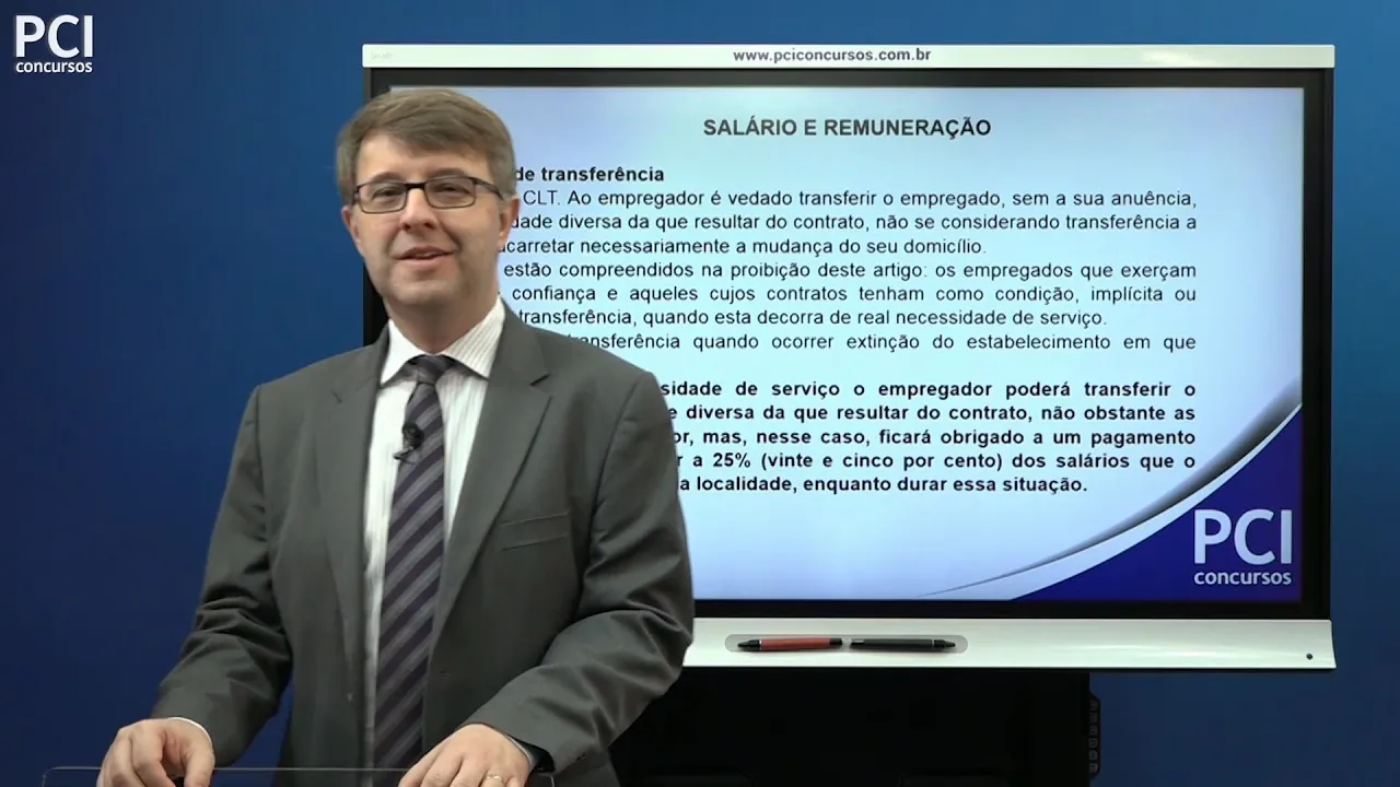 e aí o olá pci concursos tudo bem com vocês vamos dar continuidade aqui o nosso curso de trabalho nossas aulas sobre salário e remuneração nossa terceira aula e vamos começar hoje e falando do adicional de transferência que tá previsto lá no artigo 469 da clt não houve mudança neste artigo com a reforma trabalhista a redação original foi mantida e para começar temos que saber temos que ter a informação acerca do adicional de transferência temos dois tipos na do adicional de transferência desculpa vamos lá a transferência transferência pode se dar em caráter definitivo ou em caráter