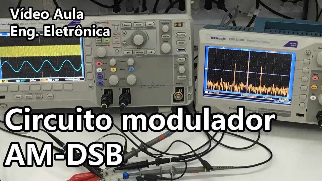 000 dividido por 4 15. 000 so 4 dá 3750 M que é igual a 3,75 km e esse é o comprimento da antena que precisaríamos para transmitir esse sinal aí vejam que isso é inviável e ainda só mais um pouquinho de matemática depois já passaremos para uma parte mais prática a modulação AM Double Side Band consiste em misturar dois sinais que é o da nossa frequência modulante que chama essa frequência mais baixa que é o sinal que queremos transmitir então é um cosseno de Ô m de t E aí multiplicamos por um cosseno de Ô C que é a frequência de uma portadora que já vou explicar o que é de t o que na realidade fazemos ainda é adicionar um nível DC vamos chamar de DC mesmo a frequência da portadora então de uma maneira bem resumida a equação que descreve a modulação dsb essa multiplicação de cossenos sendo o cosseno da nossa onda do nosso sinal modulante somado a um nível DC esse nível DC é um nível de tensão é um offset do nosso sinal e uma frequência da portadora vamos de cara passar para a simulação prática para entendermos direitinho estas questões estou aqui com LT SP aberto vamos representar com uma fonte de tensão o nosso sinal modulante Então pegando aqui vamos desenhar rapidinho o circuito F4 eu tenho uma Lab vou chamar de modulante clicamos com a direita vamos em Advanced vamos em sign para uma onda senoidal colocamos uma amplitude de 100 MV e uma frequência de 1 khz e vamos já acrescentar aquele nível DC da equação do double Side Band Vamos colocar um nível DC aqui em DC offset de uns 300 MV damos um Ok vamos de cara rodar a simulação para testar isso uns 5 MS tá bom e vejam que temos a nossa senoide nenhuma novidade com o nível DC aplicado ela inicia aqui em 300 MV e a amplitude dela é de 100 MV É verdade que esse sinal aqui é um sinal determinístico sabemos que o sinal de áudio é um sinal estocástico estacionário assim como os batimentos cardíacos mas por vias de simulação e abstração para estamos no Mundo Ideal aqui no simulador vamos utilizar este sinal a ser trans como exemplo E aí pegamos uma segunda fonte e esta segunda fonte será a frequência da nossa portadora a frequência da portadora é a sacada que os engenheiros tiveram para transmitirem baixas frequências eles misturam ou seja eles fazem uma multiplicação do nosso sinal com uma frequência bem mais alta E aí esta frequência bem mais alta viabiliza o projeto de circuitos transmissores e de antenas para transmitirmos este sinal no no ar então utilizando uma frequência bem mais alta que é a portadora ela tem esse nome porque vai portar o sinal que queremos transmitir Vamos colocar uma Label para portadora e a nossa portadora é uma onda senoidal com offset nulo amplitude de 5 v e a frequência vamos pegar 600 khz E aí já podemos ir sacando que o dial do nosso rádio o rádio AM Quando sintonizamos ali o rádio já vamos selecionando uma faixa de frequências específicas e podemos já entender que cada de rádio tem a sua frequência portadora para transmitir os seus sinais e aí ao invés de implementar um mixer aqui que é um circuito um pouco mais chatinho de fazer vamos abstrair e vamos pegar uma fonte com comportamento arbitrário que é bv aqui no LT Spice que é uma fonte de tensão com comportamento arbitrário e podemos descrever matematicamente o circuito que queremos vejam que interessante eu conecto aqui o Ground E aí temos o nosso sinal modulante temos a portadora E aí vamos fazer a multiplicação aquela multiplicação do sinal modulante com o sinal da portadora para isso clicamos com a direita aqui e e descrevemos v = v abre parênteses modulante que é a tensão aqui da fonte modulante vezes a tensão da portadora com isso já implementamos o modulador de forma bem simples vamos colocar aqui modulado para sinal modulado aqui na Label desta fonte rodando a simulação de novo agora vejam que temos o nosso sinal modulante de 1 khz o nosso sinal da portadora a frequência da portador aqui em 600 khz Vamos dar um zoom aqui está e agora Vejam a multiplicação das duas aqui no mixer E aí está a amplitude modulada eu quero que vocês enxerguem bem o que está ocorrendo Aqui Esta é a saída da do nosso mixer aqui a fonte de comportamento arbitrário que multiplicamos os dois sinais temos a frequência da nossa portadora aqui se dermos um zoom vamos ver a senoide a 600 khz E aí removendo Zoom percebam que a involt cória desse sinal acompanhe o mouse aqui isto se chama involt cória a involt contém o sinal a ser transmitido por isso que a m é amplitude modulada que eu modulo a amplitude do sinal da portadora pelo meu sinal a ser transmitido e essa sacada aí os engenheiros tiveram para poder permitir a transmissão de sinais em baixa frequência vejam que bacana isso então temos o sinal modulado surfando aqui na onda da nossa portadora O Bacana do LT Spice é que ele nos permite ver o dos sinais vamos pegar o modulante primeiro duplo clique aqui eu vejo só o sinal aqui do da modulante clico com a direita vion e fft já demonstrei uma videoaula como utilizar o analisador de espectro pela função fft do osciloscópio digital Então vale a pena conferir damos um ok e temos aqui o espectro do sinal Vejam o nosso pico em 1 khz Lembrando que o espectro analisa o eixo da frequência estamos no domínio frequência aqui pois aplicamos a transformada rápida de fourrier e estes Picos menores aqui é uma ruir do nosso sinal que já era previsto e aqui o eixo das ordenadas está em escala logarítmica podemos também ver o espectro da portadora então aqui está a portadora no tempo e a portadora na frequência e o espectro da portadora nos dá um pico aqui em 600 khz Vamos dar um zoom mais um pouco de zoom aqui vej o nosso pico aqui em 600 khz que é a frequência da nossa portadora e temos o ruído também aqui que já é natural e agora o interessante de se observar é o espectro do sinal modulado vamos pegar só ele aqui está o nosso 