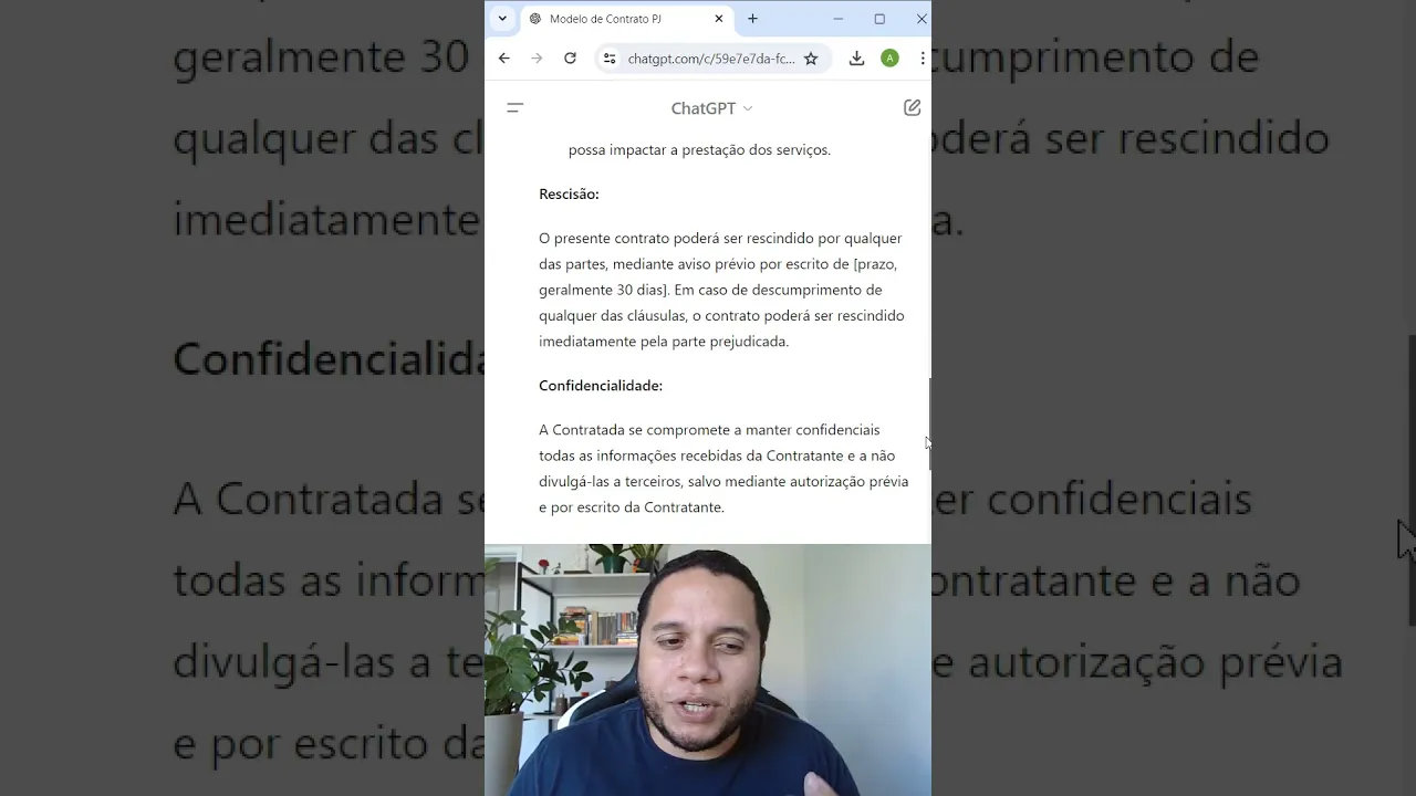 olha só que loucura essa novidade do chat GPT agora você consegue exportar para qualquer tipo de documento alguma coisa que o chat GPT gerou Olha esse exemplo aqui eu pedi pro chat chpt criar um modelo de contrato para PR contratação de PJ e só o fato dele ter desenhado o contrato aqui com bastante cláusula de um jeito bem bacana já seria interessante mas não é nem sobre isso que eu quero falar hoje tá olha só ele especifica até o foro bacana não é nem sobre isso que eu quero falar contigo tem o campo das assinaturas