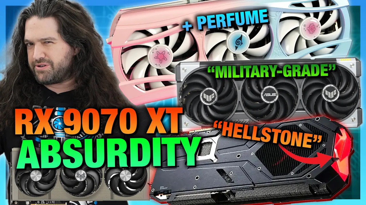 [Music] there's a new clown car in clown town and this time all of the AMD partner model gpus are spilling out of it we've done these roundups a few times now for NVIDIA like with the 50 Series and the 40 series where we round up all of the most absurd video card launches but also talk about some of the useful things they're doing in the design process now we're happy to see that the 970 XT is apparently interesting enough to amd's own partners that they too have a clown car full of absurd marketing for video cards yon is soaking its gpus in a perfume that smells like ocean water to match its waifu back blade dual tough balls return with the Asus RX 970 XT fans azrock launched its video discussing vrm electrical design to a backdrop of high BPM metal music and someone really needs to check in on powercolor to see if they're okay over there because they have literal paragraphs rambling on about how quote at its core lies the hellstone leading Gamers through the darkness to Ultimate Victory on their marketing page about uh video cards and power color your hell doesn't scare me I just spent all Thursday trying to buy your gpus at MSRP I'm already in hell in this video we'll walk through the partner models we'll talk about some of the interesting and actually good things they're doing for their design there's actually some pretty cool stuff like for example the move to more user serviceable fans is something we've always been excited about since I took aart in XFX ghost 580 several years ago so there's some cool stuff there's also just like with Nvidia and what we did there a lot of absurdity to talk about so that's where we're going to get it to and separately we'll have something to say about availability pretty soon but let's get into this one first with the clown car from clown town of GPU Partners we brought you this video with store. Gamers access. net head over to the store and grab one of our PC Building anti-static mod mats for your next System Assembly project each featuring a huge 4T X 2T build grounding straps with common ground point two scale DDR diagrams ethernet pinout diagrams screw tracking and more if you're into tabletop gaming and E-Waste repurposing you might like our inductor tabletop gaming dice each kit includes seven sharp edge resin dice with E-Waste inductors embedded within them the kit includes a custom wooden box with latch integrated roll tray and an included Goblin token card we made you can also grab one of our snowflake the cat tabletop gaming dice kits with tiny snowflake Miniatures within the dice Plus a snowflake card that we made finally you might like our project in soldering mats which have been highly popular with the DIY community visit store.