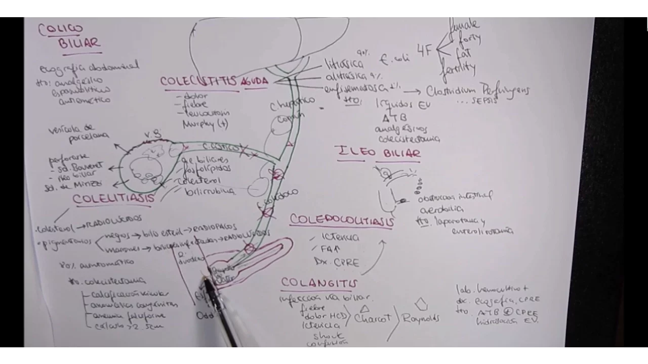 el día de hoy hablaremos de patología de via biliar como se sabe recordarán la viris se produce en los hepatocitos Este es el lóbulo hepático derecho el lóbulo hepático izquierdo esta bilis que se produce en los hepatocitos es vertida hacia los conductos biliares intrahepáticos que van a confluir todo a nivel del en dos o tres conductos y puede ser el conducto hepático derecho y el conducto hepático izquierdo ambos conductos confluyen para formar un único conducto el conducto hepático com lo vamos a hacer pequeño nada más para que quea todo este conducto hepático [Aplausos] común conducto