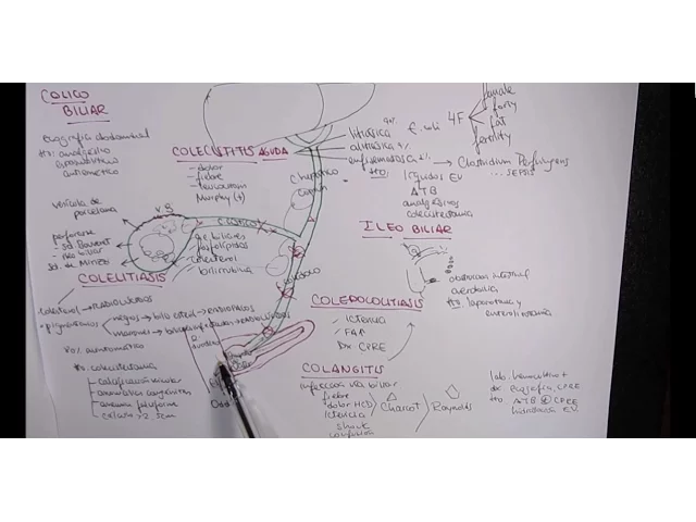complicarse con un cólico biliar una colangitis o una pancreatitis debido a obstrucción que provoca ya no sale el líquido ya no sale el líquido proveniente del páncreas debido a la obstrucción completa de la vía biliar este paciente aparte del dolor va a presentar ictericia ya que la bilis no se está drenando de acuerdo en el laboratorio podemos encontrar una fosfatasa alcalina aumentada pero no muy elevada el diagnóstico una colang grafía retrógrada endoscópica metemos un endoscopio con el cual ingresamos [Música] retrógrados el cálculo directamente el tratamiento se hace una sepre aplicamos una esfinterotomía reos el esfinter