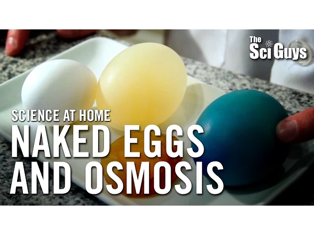 today on S guys osmosis and naked [Music] [Music] eggs welcome to S guys I'm Adam and I'm Ryan today we're going to be exploring osmosis through making naked eggs eggtastic egg salad excellent close enough osmosis is the tendency of water to move across a membrane from a dilute solution into a concentrated solution the ingredients you're going need for this experiment are an egg some vinegar corn syrup and food coloring and the equipment includes a glass and an old spoon or gravy leadle the reaction we're creating today isn't dangerous but it's always a good idea to