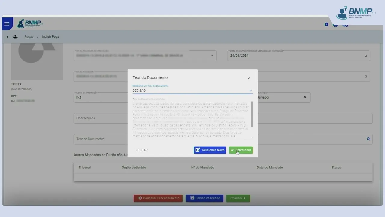 ao mandado de internação o local da internação a uf o município eventuais observações existentes e o teor do documento selecionando o que se adequa ao caso concreto E clicando na opção selecionar clique em próximo o sistema apresentará as informações lançadas para fins de revisão Caso haja necessidade de retificação de algum dado utilize o botão anterior o usuário poderá ainda utilizar o botão salvar rascunho em caso de modificações que demandem o levantamento de dados não disponíveis no momento inexistindo a necessidade de alterações utilize o botão finalizar peça Digite o usuário senha e Clique na opção concluir