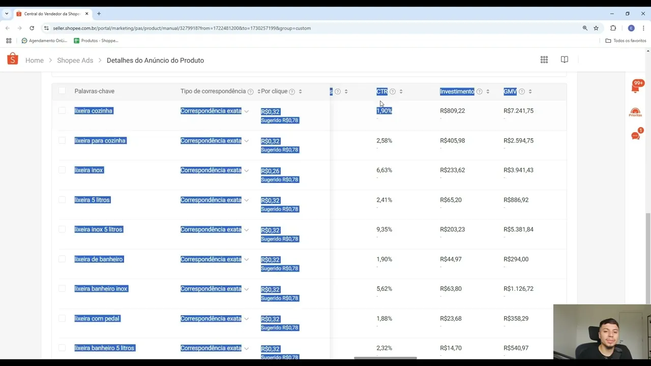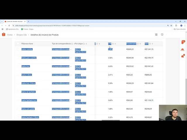 pessoal depois de você ter entendido como criar o seu anúncio de busca agora eu venho mostrar como você vai analisar se tá fazendo sentido ou não o seu ads se ele tá fechando em questão de os valores tá fazendo sentido o teu investimento se você deve mudar para você entender as métricas no geral Beleza então vamos lá primeiro passo eu vou bater o olho aqui nas métricas eu vou ensinar tudo para vocês aqui de cada um uma para você chegar aqui nas métricas vamos vir aqui clicar aqui e eu vou aqui ensinar todas as métricas para vocês e depois vou mostrar como você analisa isso no seu ads Ok basicamente pessoal impressões é o número de vezes que Os compradores vencem o anúncio não tem muito o que dizer basicamente é nesse caso aqui ó 155. 000 pessoas viram o meu anúncio com base nessa palavra lixeira certo cliques são quantas pessoas clicaram no meu anúncio então de 155. 000 2945 clicaram Ok CTR ele mede a frequência que os meus clientes clicam no meus anúncios basicamente se você quiser descobrir o CTR você pega o número de cliques e divide pelo número de impressões essa aqui é a fórmula ó e depois multiplica por 100 que vai dar 1 90 nesse caso aqui que a gente tá usando Ok investimento é realmente quanto Você investiu no eds não tem muito o que dizer GMV o quanto você faturou no eds E aí começa a ficar agora mais interessante aqui para vocês entenderem Veja só conversões o que são conversões ó é o número de vezes que Os compradores compraram qualquer produto da sua loja dentro de 7 dias após terem clicado no seu anúncio entenda existe muita venda que parece venda fantasma quando você faz ads você fez ads ontem e aí amanhecer o dia você olhou e hoje disse que você vendeu pelo eds é porque aquela venda de ontem Talvez o cliente ele botou no carrinho mas só pagou depois tudo isso tá então se o cliente terminar o pagamento em até 7 dias depois de ter entrado naquele seu anúncio pelo eds a conversão vai ser contabilizada certo então são 100 28 operações de venda que ocorreram nessa palavra-chave só que aqui pode ser que o cliente colocou duas unidades Pode ser que ele colocou uma unidade desse produto e uma unidade de outro existem diversas variações aqui e para você saber exatamente Ok Rony quantos itens foram vendidos de fato nessas conversões você virá aqui ao lado ó em itens vendidos E então você precisa ter ele Ó aqui tá vendo se eu desabilitar qualquer Campo aqui ele deixa de aparecer na minha tela Então você precisa ter esse campo habilitado então você pode ter feito 128 operações que são conversões mas ter conseguido 148 vendas no geral acos e ras o que que são esses dois aqui que são os mais falados o ras ele basicamente você pode ver aqui para sempre que você tiver dúvidas sobre algo a Shop tem aqui a explicação mas ele basicamente ele vai ter esse cálculo aqui que é você pegar o seu investimento e dividir pelo seu gasto para você entender se tá sendo lucrativo seu eds então você vê a explicação que ele mede a receita que é gerada pelo seu anúncio em relação ao custo como que eu recomendo para vocês um R saudável pelo menos isso não é uma regra Tá mas pelo menos o ideal é que ele esteja próximo ali de 10 para cima que é o melhor dos mundos tá ele precisa est por ali se ele tá abaixo disso significa que você tá tomando prejuízo pode ser que sim pode ser que não vai depender da sua margem de lucro esse produto Aqui nós temos uma margem que tá indo muito boa então ele me permite trabalhar gastando um pouco mais só que também tem uma variante aí produtos novos sempre vai gastar mais do que produto que você já tem venda Então quando você vai iniciar um ADS você tem que ter total noção de que se o produto não tem venda vai gastar um pouco mais no início e foi o caso daqui era um produto que a gente começou testando forçamos ali umas vendas Então nesse momento aqui do vídeo tem palavras que ainda não estão desenvolvendo Como eu queria porém com o tempo elas vão desenvolvendo mais até porque se você for ver as de baixo ó no geral tem algumas com R 16 13 26 por quê foram as primeiras palavras chaves que eu fiz e muitas dessas aqui eu fui adicionando nas últimas semanas nos últimos dias para poder começar a colocar para rodar então tudo tem essa situação tá muitas palavras-chaves são mais recentes então leva mais tempo para poder você ver se vai deixar no exata se vai deixar no busca aqui por exemplo eu coloquei tudo no exata porque quando tava no busca não tava tendo uma não tava valendo a pena o tanto de venda que trazia pro custo de conversão que a gente já vai chegar lá então tudo isso você precisa ver ok beleza então o ras você entendeu que ele basicamente vai medir o seu faturamento com o investimento que você tá tendo e o aquos ele basicamente também vai ter muito ligação a à mesma coisa só que de uma forma diferente ó ele mede o quanto o seu anúncio custa em relação a à receita que ele gera e o cálculo você pega a sua despesa né que é o seu investimento e divide pelo seu faturamento e multiplica por 100 e daí só para você entender quando seu R está alto seu os vai ficar baixo e vice-versa então ó esse aqui que eu tô testando Ó o meu R tá ruim mas meu axus né acaba ficando alto então você precisa entender que pro seu Ed ser bom seu R tem que tá alto e seu acos tem que tá baixo como nesses casos aqui e você já vai entender como o seu acus precisa estar para você não tá tomando prejuízo sem saber pelo eds aqui temos taxa de conversão que nada mais é do que você entender Qual é a porcentagem de conversão de sucesso no caso né das suas vendas pela palavra-chave aqui a gente vê que eu tô tendo uma taxa de conversão muito alta ó 7% 10% ou seja aqui até 15 ó 15% das pessoas que entr no anúncio Estão comprando devido aquela palavra-chave é um número excelente custo por conv