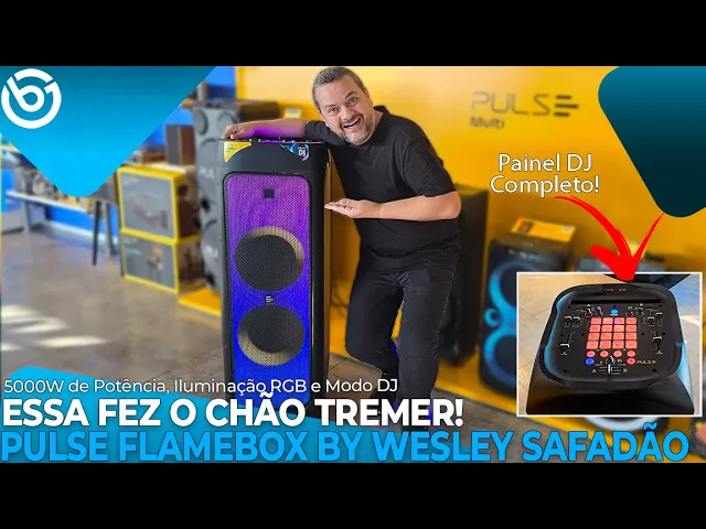 essa caixa de som que vocês estão vendo é simplesmente a nova Pulse Flame Box by Wesley Safadão e ela impressiona pelo seu visual e também pela qualidade sonora São simplesmente 5000 w de potência RMS ela ainda conta com iluminação RGB modo DJ permite você conectar dois positivos Bluetooth simultaneamente ou duas outras fontes de áudios Porque além da conexão bluetooth Ela traz entrada para cartão VEM também com conexão P2 possui o modo tws é possível conectar duas caixas simultaneamente E olha como se precisasse porque são 5000 w nesse vídeo aqui eu vou tentar mostrar a potência