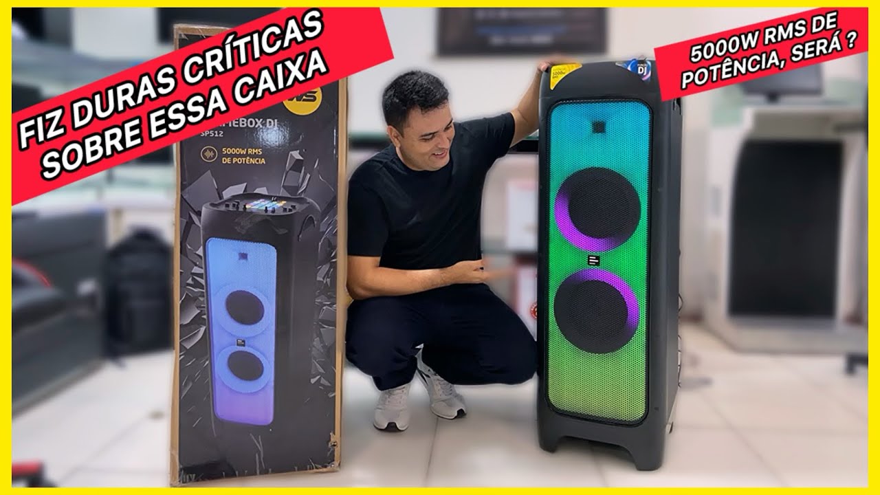 tem 112,5 C de altura reparem que eu que tenho 1 73 e ela tá batendo quase aqui passou da minha cintura porque é uma caixa muito grande isso é necessário porque ela traz aqui dois altofalantes de 8 polegadas mais dois subwoofers de 12 polegadas para poder garantir a potência sonora de até 5000 w RMS e ela também conta com Twitter de 2 polegadas eles são posicionados aqui nessa região vocês notaram que temos aqui iluminação RGB aqui nessa parte frontal temos uma tela de metal e por baixo temos os altofalantes também temos a iluminação RGB inclusive