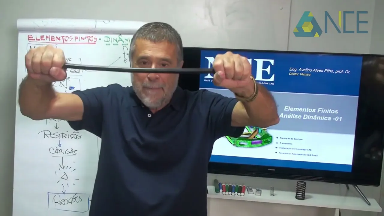 Olá gostaria de em primeiro lugar agradecer a todos que estão inseridos no nosso projeto do EAD e que fizeram o curso de estática e esse curso agora orora é a consequência o complemento a continuidade de tudo que a gente aprendeu na estat que é análise dinâmica baseado nesse segundo livro da coleção elementos finitos à base da tecnologia cae Ok e nós vamos usar integralmente aqueles conceitos que nós abordamos na análise estática o conceito Central o conceito mãe que a gente viu era o conceito de rigidez então gostaria vou pedir licença para vocês de fazer uma