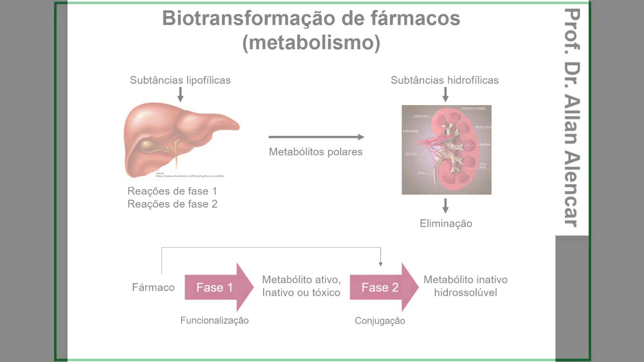 a ir à tarde lá de Tapas farmacocinética as metabolismo Vale destacar que o metabolismo um processo fundamental para a eliminação de diversos fabrico e também afeta de modo importante a biodisponibilidade oral de um tecido [Música] e biótico forças exógenas não essenciais a que estamos expostos como os fármacos e que idealmente devem ser eliminadas do organismo o sistema metabólico se desenvolveu com o mecanismo de depuração de xenobióticos sendo fígado é o principal órgão do metabolismo que modo geral as reações metabólicas falam produtos mais hidrossolúveis seus precursores o que facilita a eliminação por excreção renal é possível