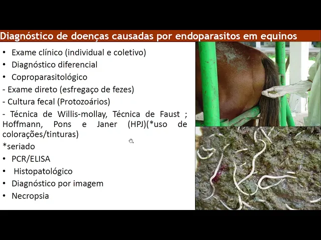 Olá pessoal hoje nós vemos falar sobre doenças causadas por endoparasita equinos assunto este presente na disciplina doença para as tarefa dos animais no curso medicina veterinária do ifan no plano de aula nós temos os seguintes objetivos discorrer sobre as principais doenças para as paras causadas por indo parasitas equinos e descrever a etiopatogênese e citomatologia diagnóstico terapêutica e profilaxia de doenças causadas por endoparasitos em equinos inicialmente a gente vai comentar de maneira geral sobre essa tomatologia dessas doenças causadas por indo parasito em equinos é importante a gente entender que esses sinais em sua maioria não são