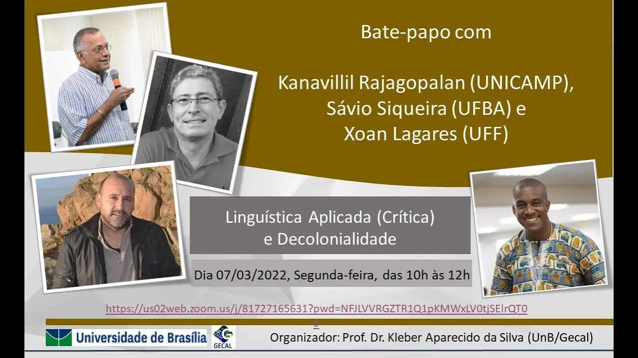 comigo arduamente né Para a gente organizar esse Então gostaria de soltar todos vocês que ficaram amigos de várias partes do Brasil aqui então hoje Nós vamos ter oportunidade singular de receber três grandes especialistas três queridos colegas têm inscritos amigos que dispensa qualquer apresentação nós vamos ter oportunidade de hoje de receber o seu kanavillil rajagopalan da Unicamp o professor Sávio Siqueira da Universidade Federal da Bahia e professor Show Lagares e eis a novidade eu estou em lambda do nosso curso de letras e também nosso grupo de pesquisa gostaria de cumprimentar o professor Kanavillil rajagopalan o professor