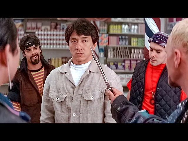 pela escada de incêndio enquanto o personagem de Jackie Chan foge dos motoqueiros em outra parte da cidade está acontecendo uma reunião de criminosos ladrões de aparência perigosa estão tentando vender diamantes Roubados para os homens de terno nesse momento os Motoqueiros frustrados com o fracasso planejam levar a motoqueira de volta para casa ela é a namorada do líder do grupo mas pede a ele que não suba e deixa os rapazes Ângelo Diz ao chefe que é hora de se livrar da moça insubordinada mas recebe alguns insultos em troca enquanto isso que é um passeia pela rua