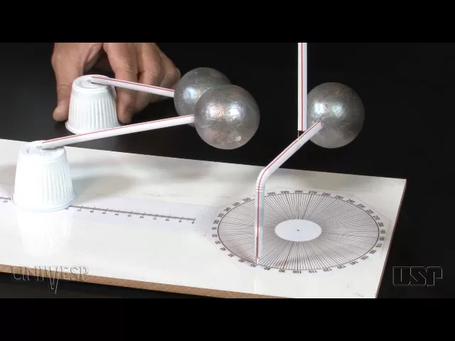 neste experimento usaremos esferas de isopor pintadas com tinta condutora e isoladas com canudinhos de refresco um pêndulo de torção feito com outra esfera Idêntica aos primeiros um eletróforo de volta feito com forma de pizza e uma placa de forro de PVC inicialmente esfregamos a placa de PVC para eletrizá-la em seguida carregaremos a forma de pizza por indução e a encostarem nas esferas de isopor eletrizando-a por contato podemos observar que as esferas passam a se afastar ou seja se repelir pois ambas adquirem cargas de mesmo sinal estas forças de repulsão podem ser determinadas por meio do