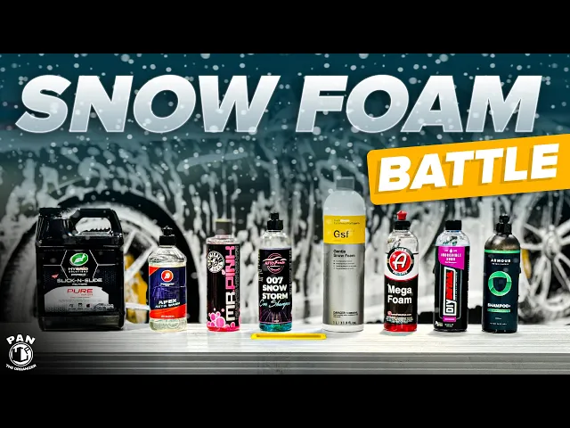 [Music] hey what's up guys welcome to another episode of pan the organizer So today we're doing a battle of snow Foams so here behind me I have a selection of eight very popular Snow Foams uh some are consumer grade that can be easily found uh in a local auto part store and some are also more prummer or professional type products so first of all what is a snow foam well a snow foam is a type of shampoo or soap that you're going to put into a foam Cannon you're going to pair that up with your