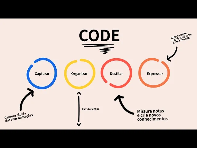 aprofundar no coaching antes da gente efetivamente começar a ver como tudo isso funciona na prática vamos recapitular O que é exatamente o Code ele é uma acrônimo cada letra tem um significado e o c é de capturar é como a gente captura as informações o o é de organizar é como a gente organiza essas anotações que a gente vai fazendo durante os dias depois nós temos o d destilar é quando a gente vive aquela nota e a partir de várias notas cria um novo conhecimento e por último nós temos o e de expressar é quando