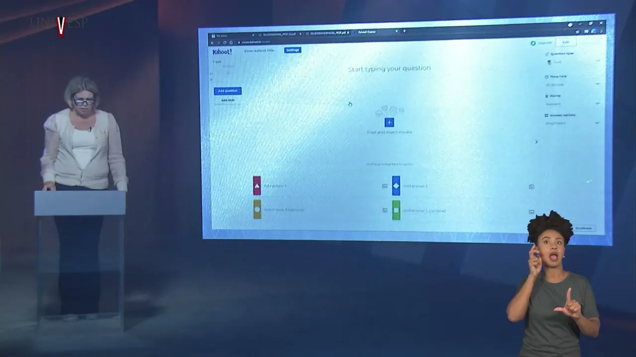 Ou dobro de pontos então nós podemos aí fazer ainda algumas opções com relação a cada uma das nossas e questões podemos ainda adicionar mais questões ao nosso ao nosso questionário Vamos colocar aqui por exemplo Qual é a questão correta podemos novamente mudar aqui o limite de tempo Vamos colocar esse 10 segundos para ficar mais difícil e assim por diante podemos adicionar questões e vou agora eh concluir esse questionário eh eu posso colocar então o título desse questionário eu vou colocar como educação mediada por tecnologia tá que é a o título da minha disciplina Vou colocar