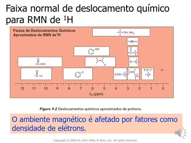 preferimos chamar de hidrogênio é própria e h mais uma molécula orgânica por exemplo ciclo-hexano não tem h mais tem 12 átomos de hidrogênio me fala um pouco sobre deslocamento químico esse que é representado pela letra delta a sua cabeça químico é a posição de um sinal ao longo do e disse que nós mencionamos pode variar desde zero até aproximadamente 12 e o deslocamento simples cada sinal fornece informações sobre o ambiente estrutural dos novos que produzem esse sinal esse ambiente estrutural é corresponde é a densidade eletrônica em torno desse átomo de hidrogênio isso vai ser ilustrado
